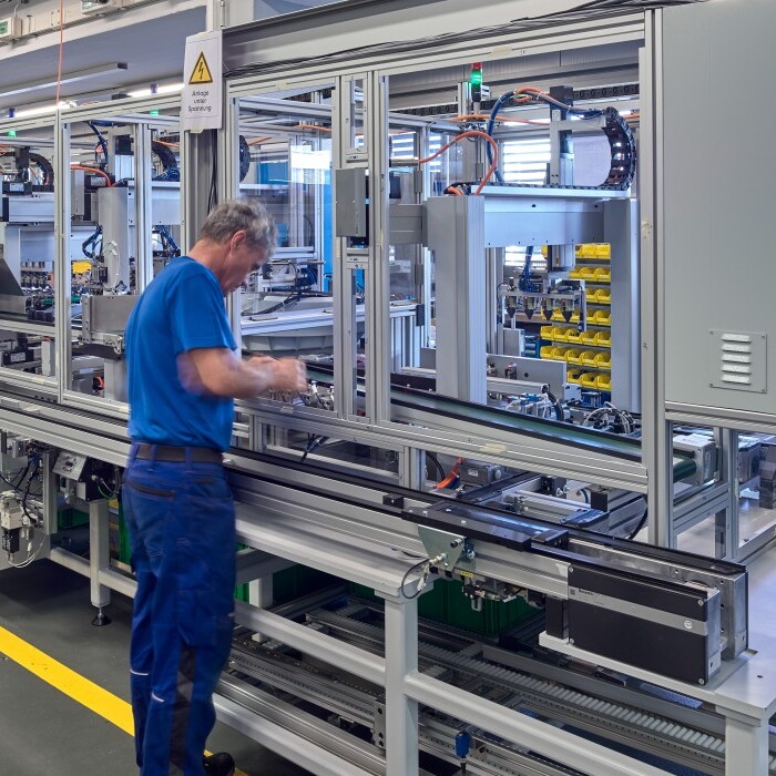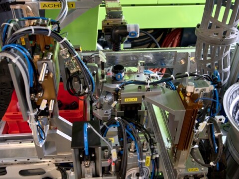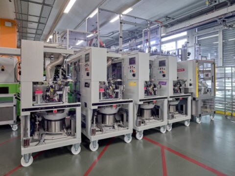 The challenge for the equipment engineering team was not only to adhere to the tight schedule leading up to the start of large-scale production, but also to fully link together the injection moulding system and parts assembly for producing the FlowFit fittings. This is a first – at least in piping production at Geberit. Put simply, linking means that all production-relevant steps – from heating the plastic granules, curing the fittings and attaching the press body all the way through to packaging – have to be carried out directly on site. In other words, an optimal production process without downtimes or the need for temporary storage.